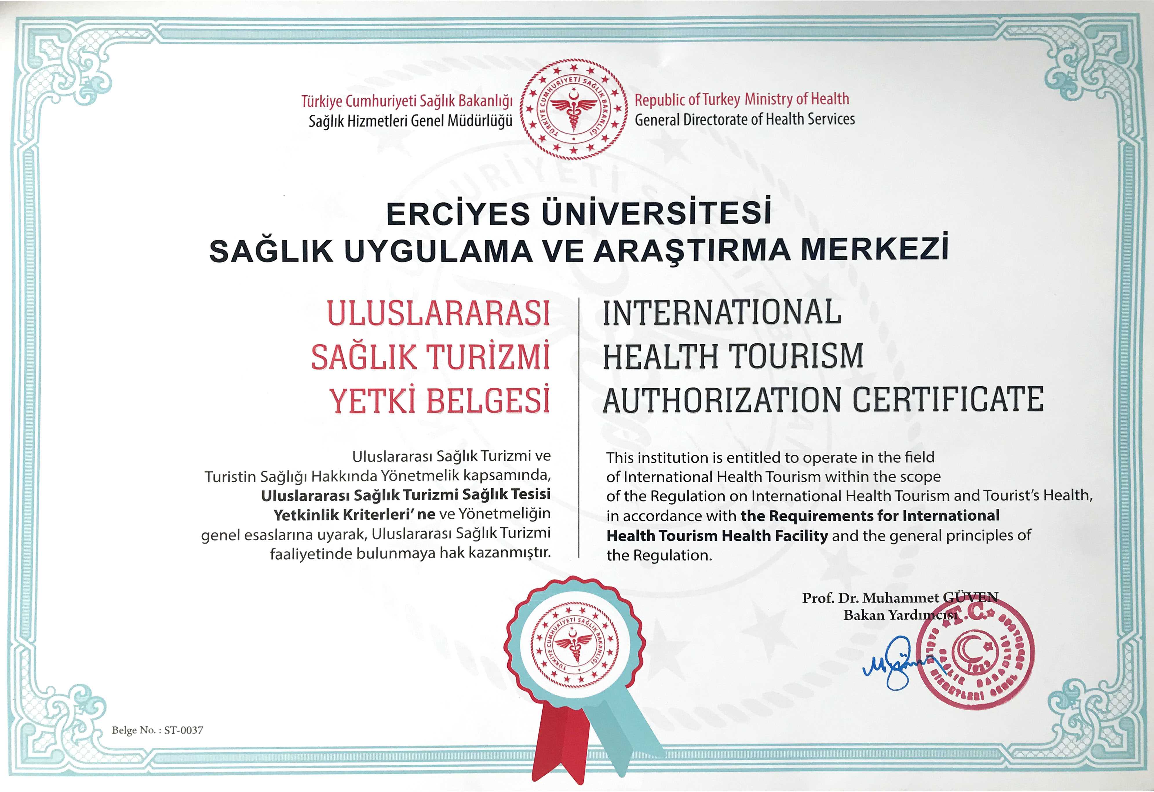 Erciyes Üniversitesi Sağlık Uygulama ve Araştırma Merkezinde Uluslararası Sağlık Turizmi iş ve işlemleri 13.07.2017 tarih ve 30123 sayılı Resmi Gazetede yayımlanan Uluslararası Sağlık Turizmi ve Turistin Sağlığı Hakkında Yönetmeliğe göre alınan Sağlık Turizmi Yetki belgesi ile yürütülmektedir.